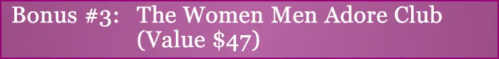 I’ll even include a bonus option of a free 30 trial to The Women Men Adore Club where I will work with you and a select group of other smart and successful women and so you can ask me questions about your most pressing relationship needs.
